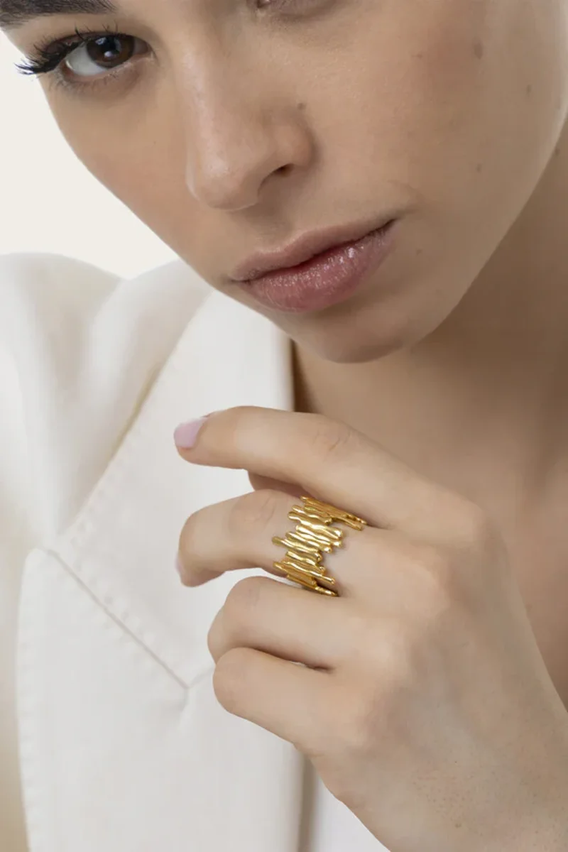 Anello in acciaio gold plated. Questo gioiello iconico cattura tutta la forza della materia fusa con una texture irregolare e vibrante. Il design regolabile rende questo pezzo un vero statement organico, da indossare come protagonista assoluto o da combinare con altri anelli bold. Nickel tested.