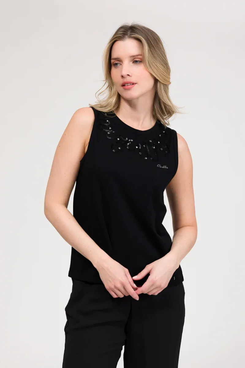 Canotta nera a scollo tondo con ricamo sullo scollo in perline e paillettes.