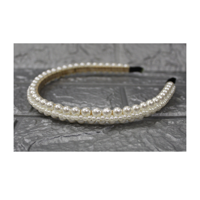 Cerchietto con base in metallo dorato decorato con tre file di perle in due dimensioni.