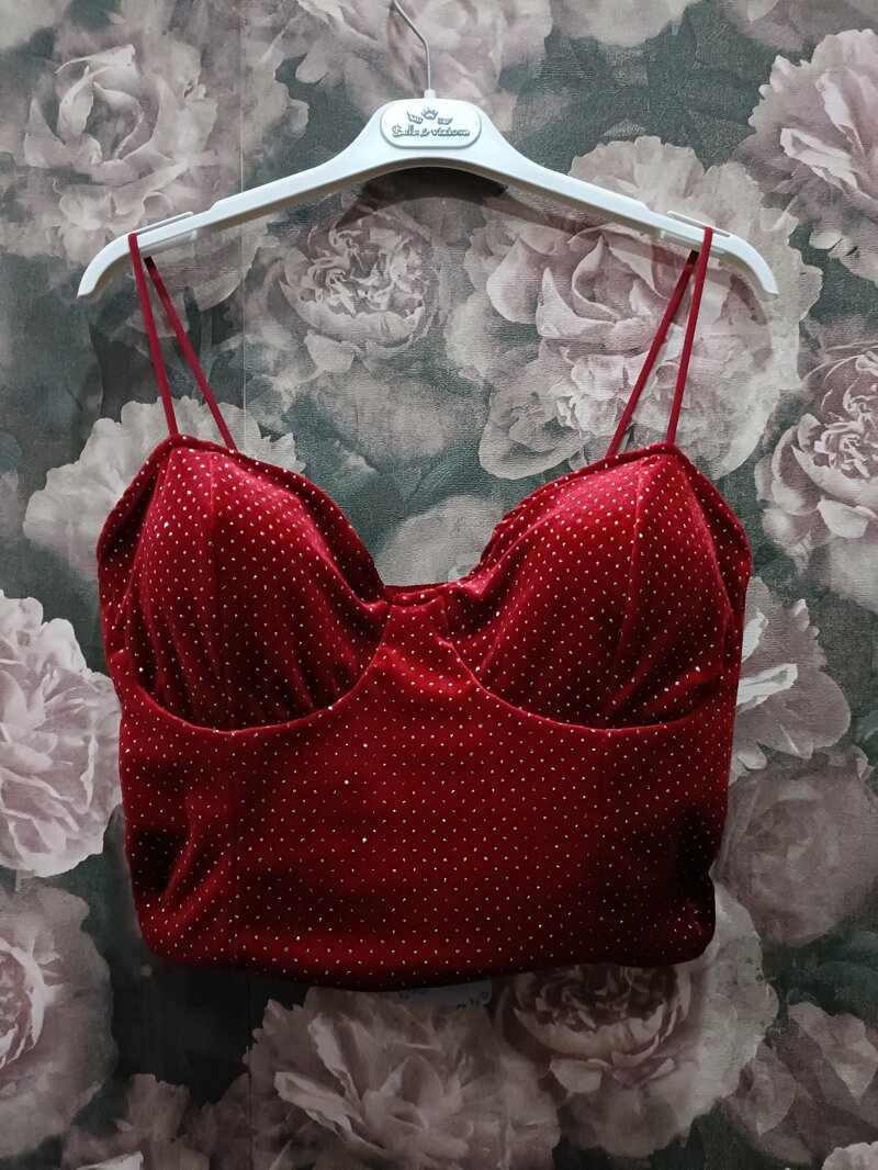 Corpetto in ciniglia foderata con micropois argentati coppe integrate e elastico sul retro.