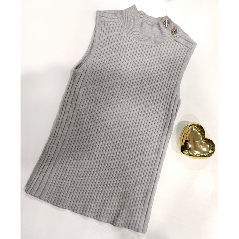 Lupetto a costine smanicato, con costine orizzontali sulle spalle e bottoni decorativi metallici sul collo.