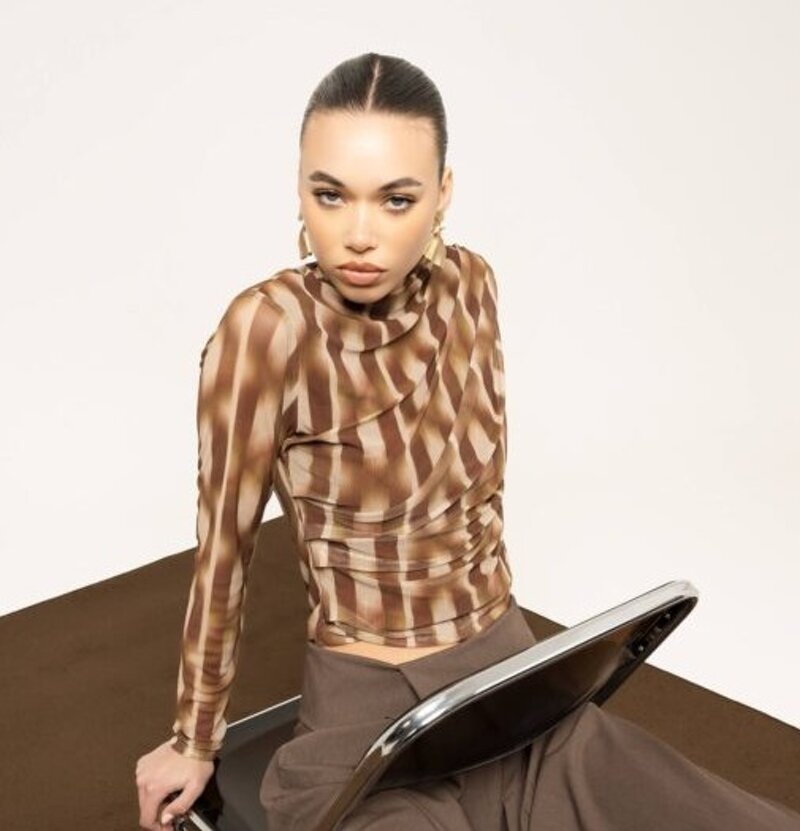Maglia in tessuto a rete tresparente con fantasia righe sfumate ad effetto ottico in diverse tonalità, foderata tranne alle maniche, con mezzo collo e arricciatura laterale.