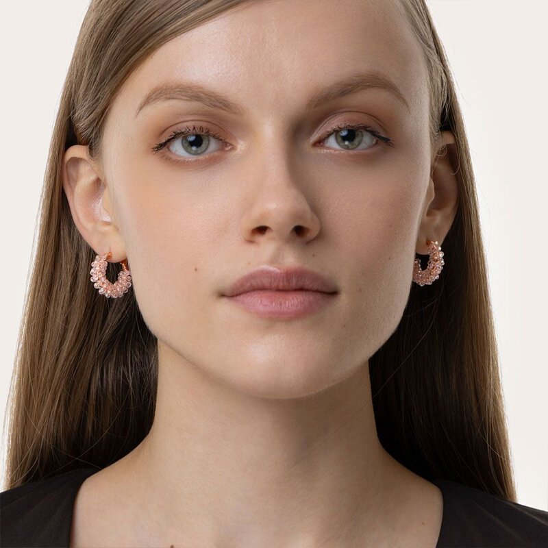 Orecchini a cerchietto con lavorazione in microfilo con cristalli rosa, nickel tested.