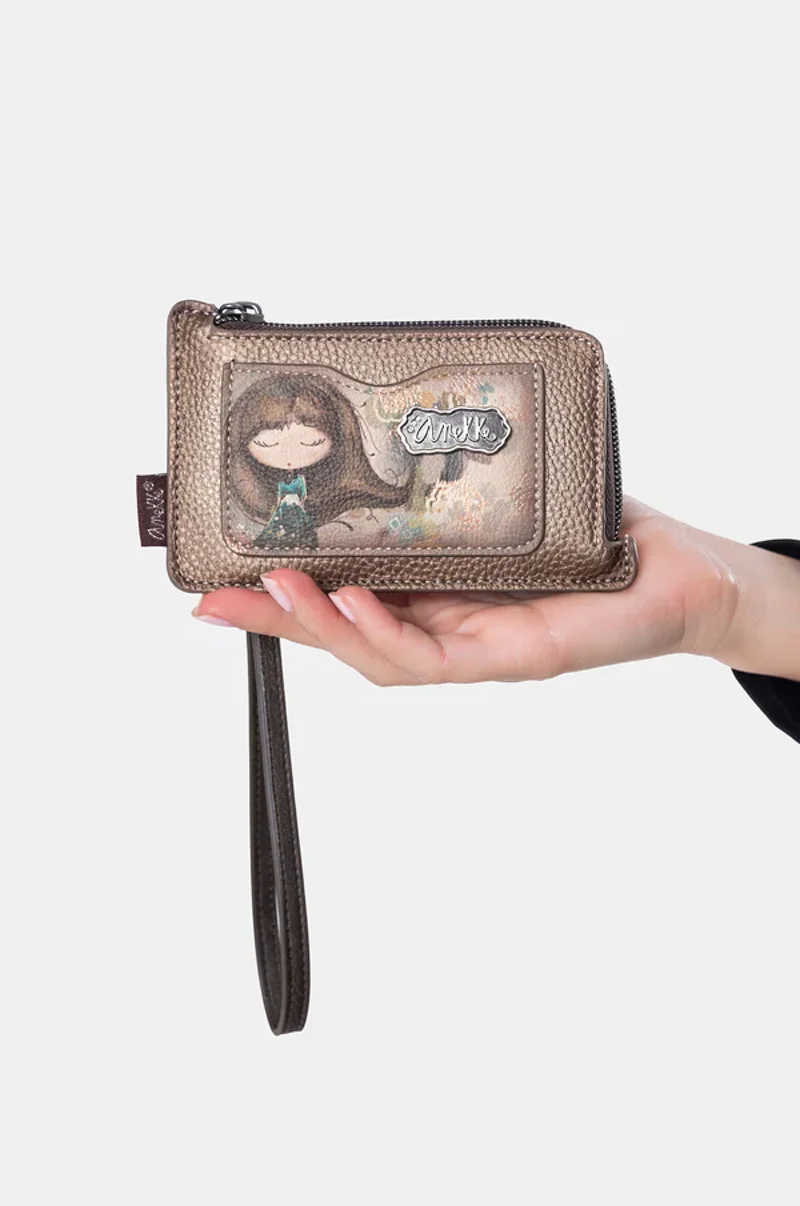 Portacarte con taschino sul davanti con stampa bambolina, cerniera superiore portamonete, retro con taschini per tessere, polsino sganciabile.