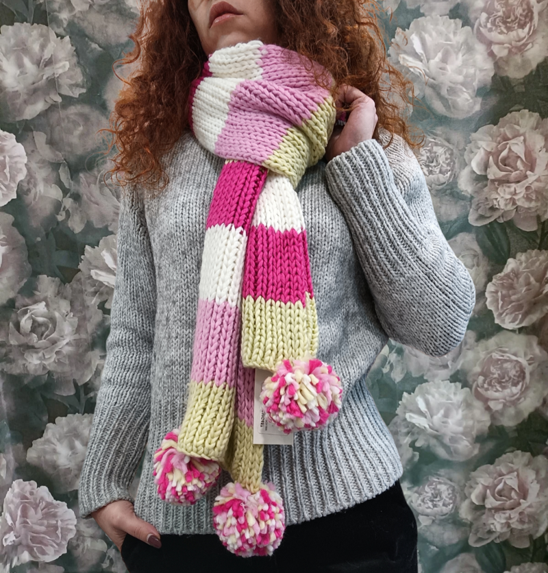 Sciarpa in maglia a righe con pon pon.