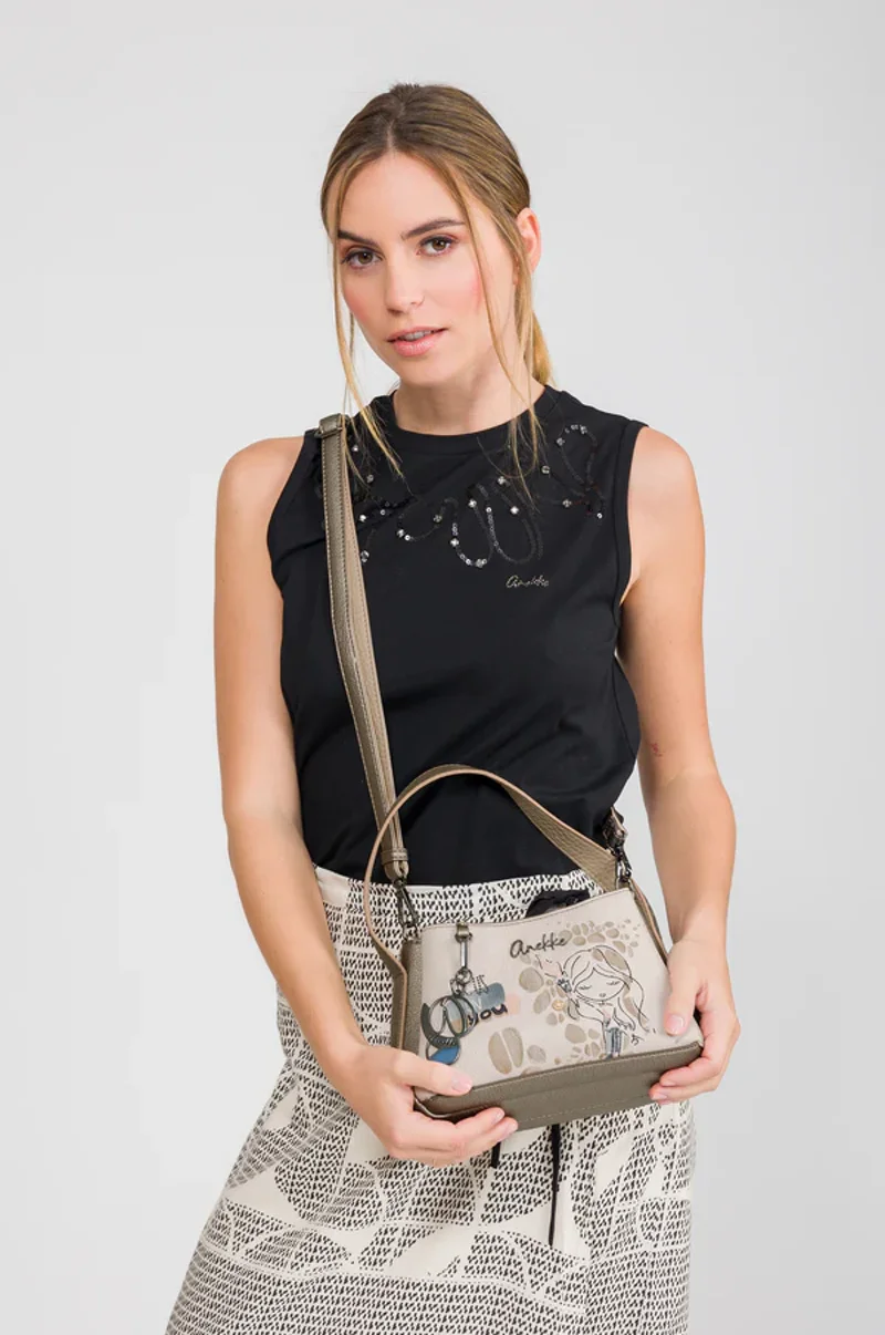 Borsa a mano con manico corto, fronte con fantasia bambolina e retro bicolore con stampa e slogan e taschino con cerniera, tre scomparti, di cui il centrale con cerniera e i due laterali con bottone a pressione, tracolla regolabile compresa.